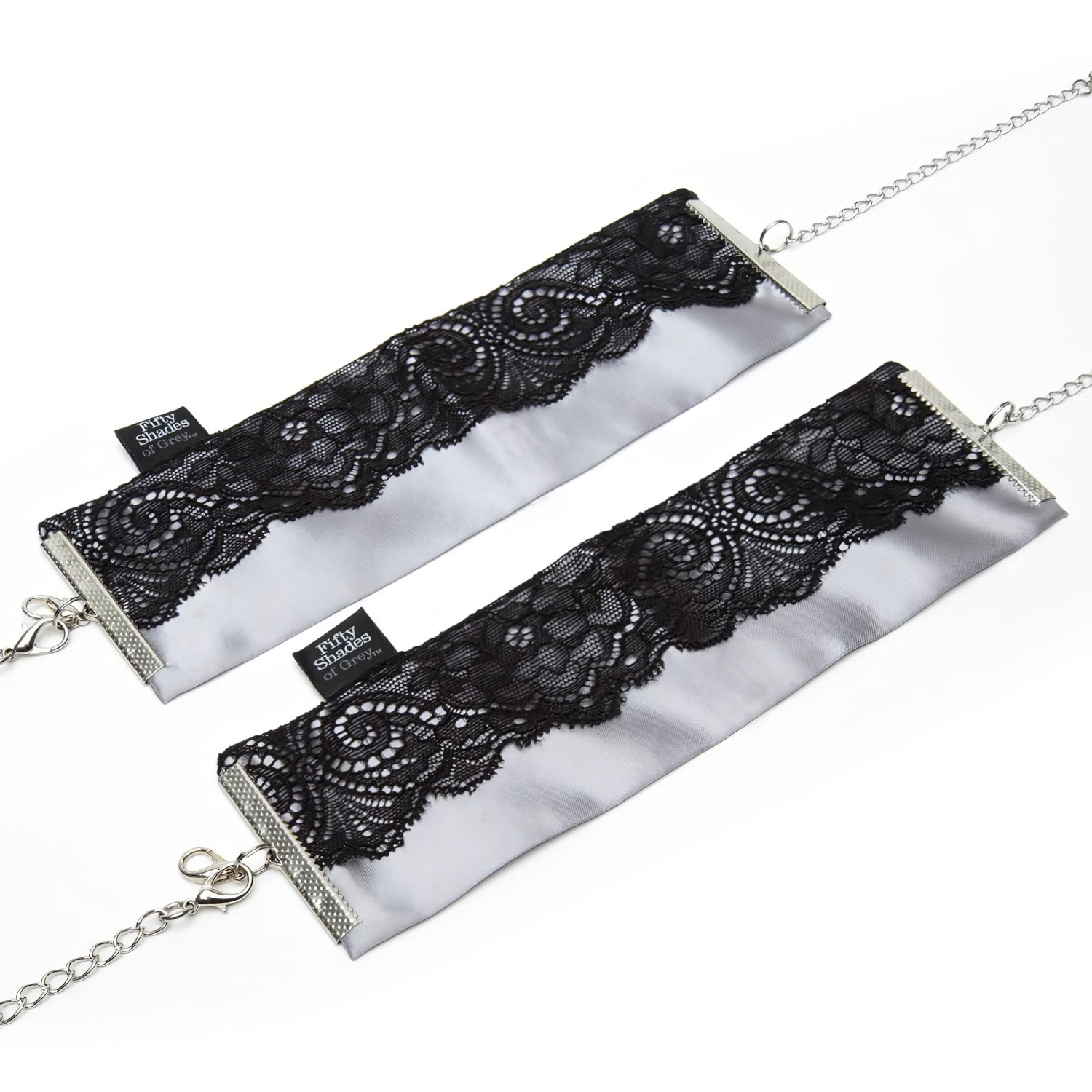 Érzéki, ezüst színű szatén bilincs pár, finom, fekete csipke díszítésekkel.