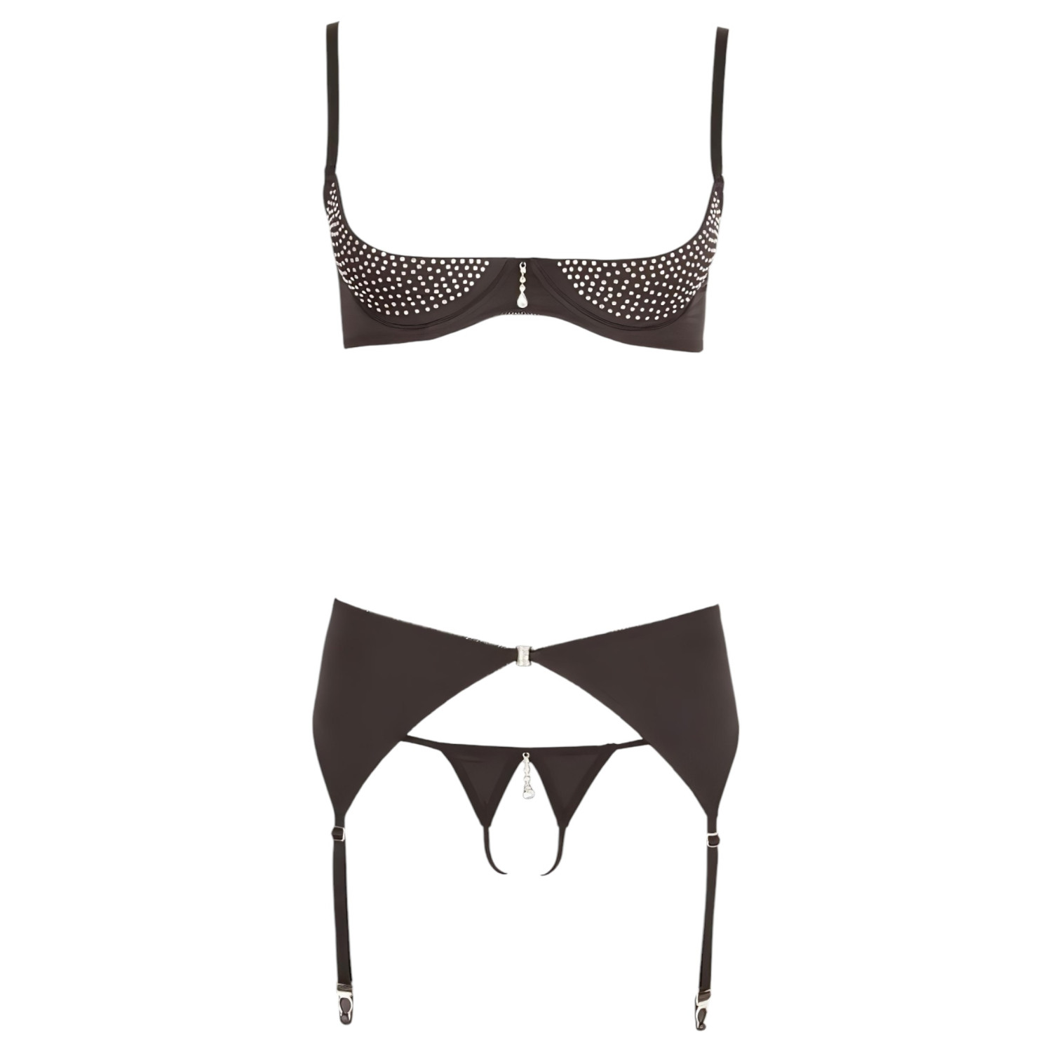 A mellemelő kialakítás gyönyörűen kiemeli a kebleket, miközben a strasszkövek ragyogása luxus megjelenést kölcsönöz. A szettben található nyitott tanga és állítható harisnyatartó pikáns és elegáns egyszerre. Tökéletes választás romantikus estékre vagy ajándéknak egy különleges alkalomra.