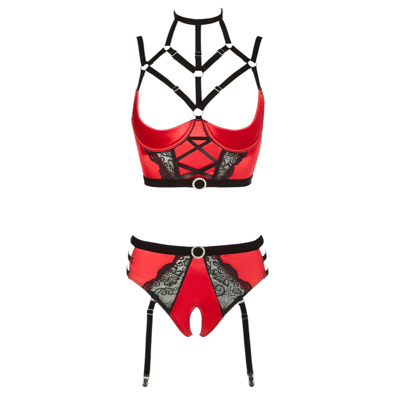 Impozáns és ellenállhatatlan fehérnemű szett merész, elegáns stílusban, melyet pántos részletek, fekete csipke és csillogó strasszok tesznek igazán egyedivé – Abierta Fina gyűrűs mellemelő szett!
