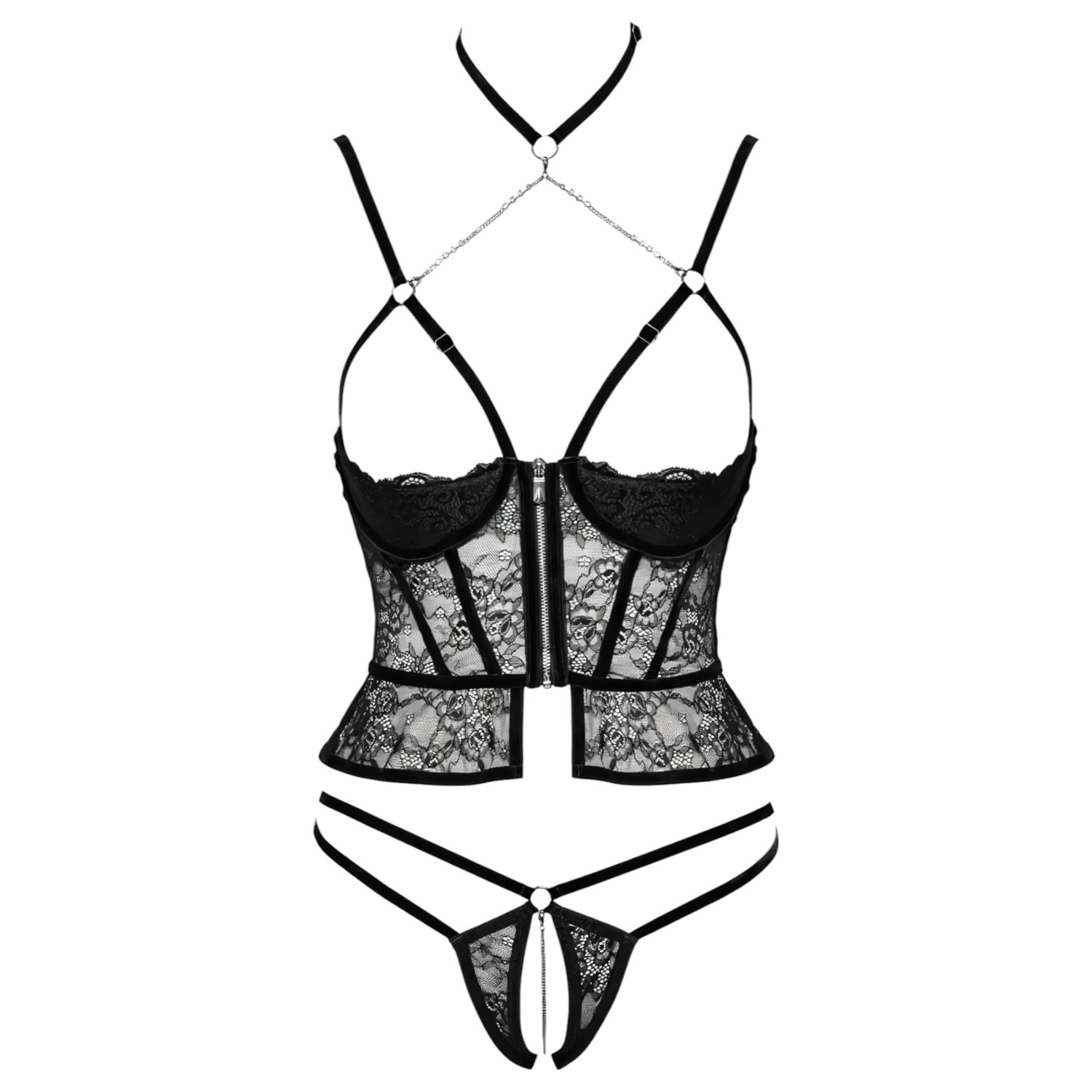 A puha csipke anyag kényelmes viseletet biztosít, miközben érzékien kiemeli a nőiességet. A mell alatti merevítés gondoskodik a szép tartásról, a középen cipzáras kialakítás pedig praktikus és szexi egyszerre. A teljesen nyitott tanga ezüst lánccal díszítve rendkívül csábító, míg a levehető nyakpánt ékköves részletekkel luxus hatást kelt.