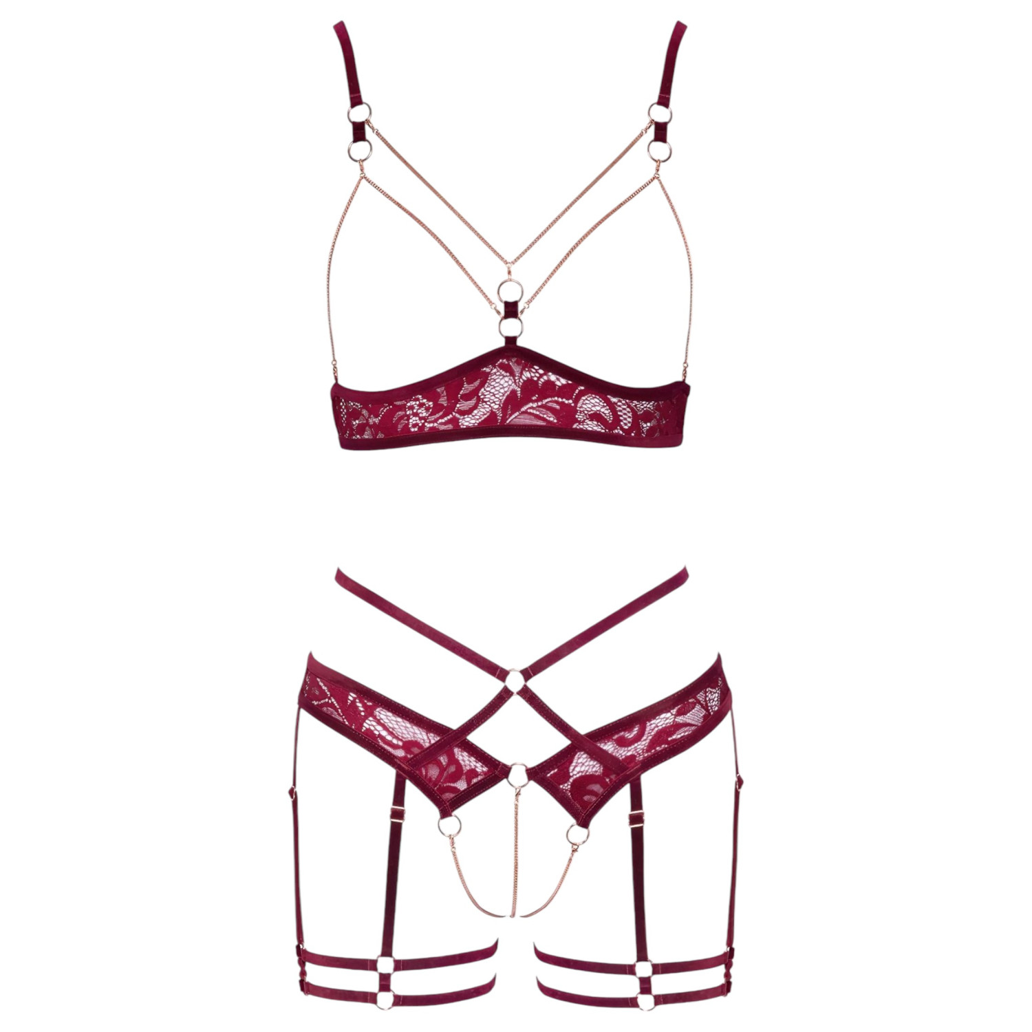 Érzéki és elegáns fehérnemű szett, amely vadító piros csipkéből és különleges rózsaarany láncos díszítésekkel készült – Abierta Fina láncos mellemelő szett!