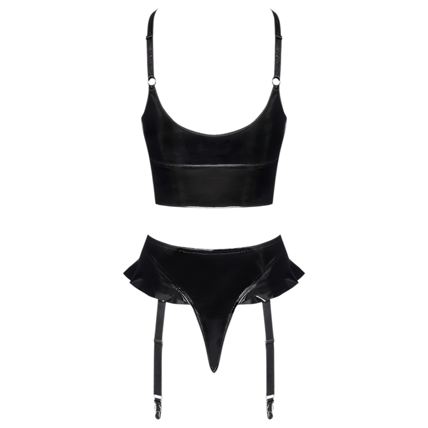 • 1 darab vinyl tanga állítható, levehető harisnyatartó pántokkal és frill díszítéssel