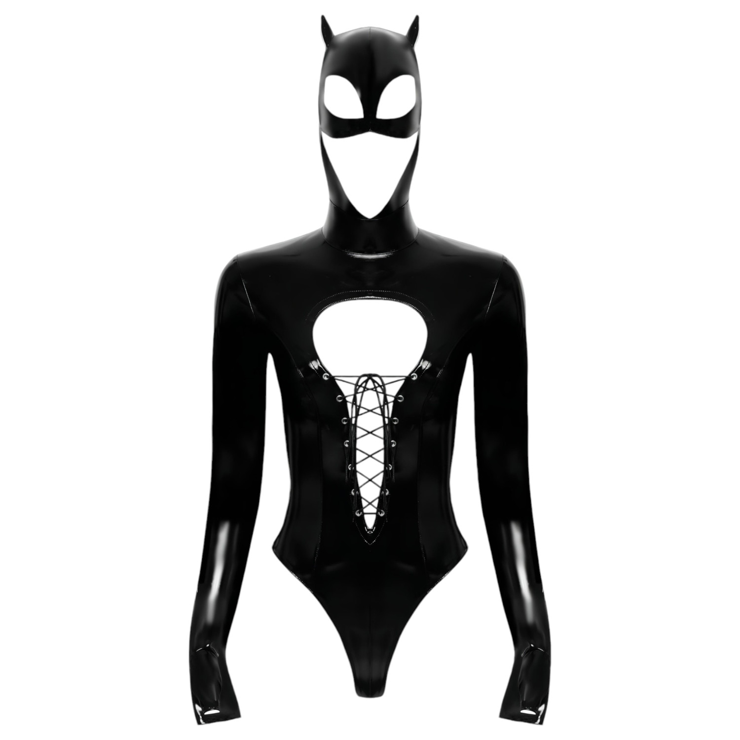Koromfekete fényes body hosszú ujjakkal és fűzős díszítéssel... na és persze a legjobb: