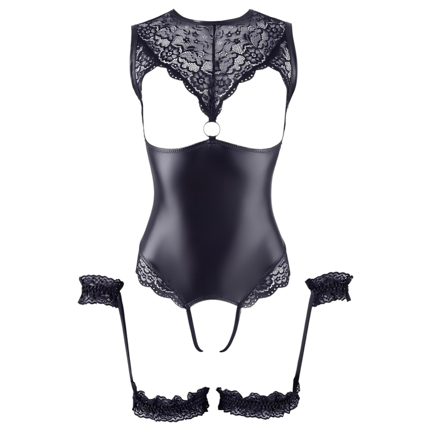 Cottelli Bondage - fényes nyitott body és kar bilincs (fekete)