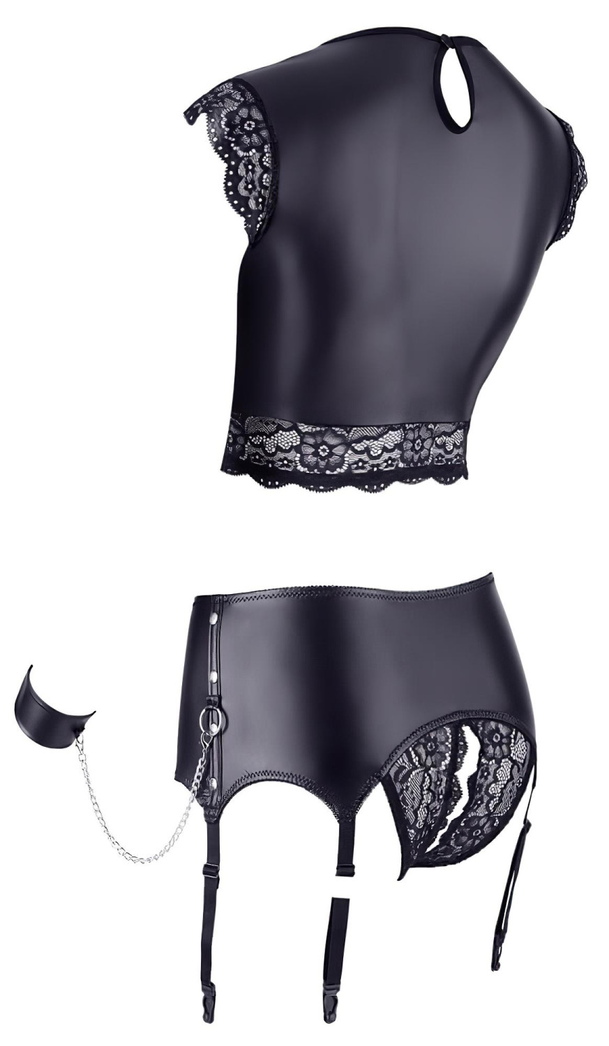 • Izgalmas kiegészítők: A fém gyűrűk, szegecsek és láncok nemcsak díszítik a szettet, hanem lehetőséget adnak a kreatív és szenvedélyes együttlétekre.