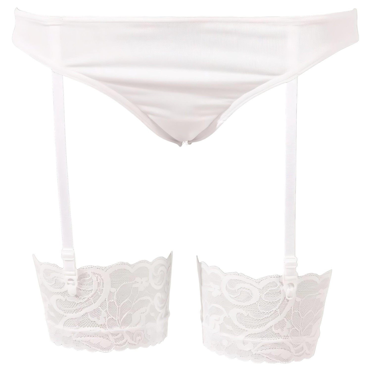 • Csipkés harisnya: Fehér színű, rugalmas, enyhén fényes anyagból, virágmintás csipkeszegéllyel, amely elegáns megjelenést kölcsönöz.