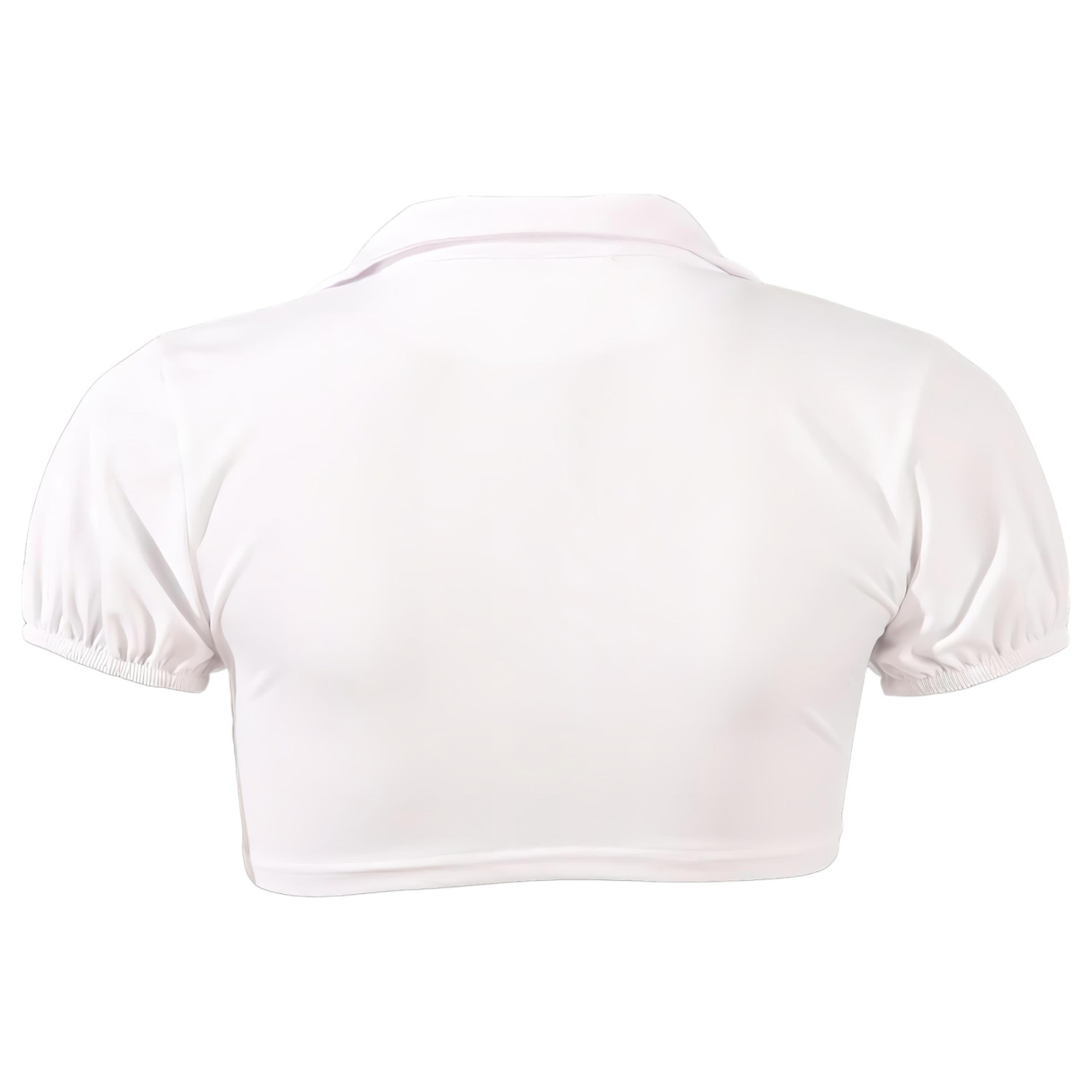 • Rövid fazonú top: Ruganyos, fehér anyagból készült, elöl megköthető kialakítással és extra mély, kerek dekoltázzsal, amely kiemeli a vonalaidat.