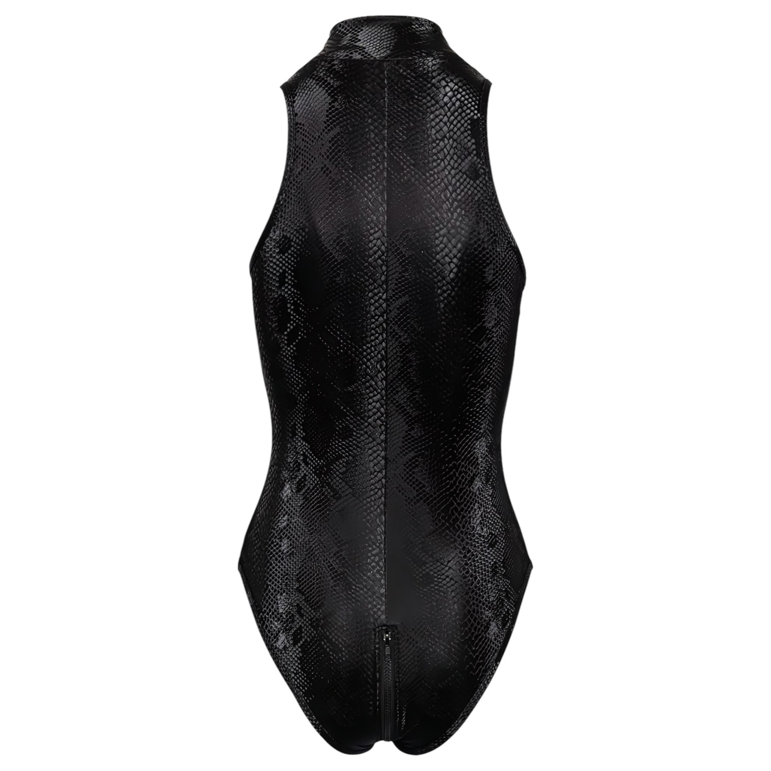 Kígyóbőr mintás body magasított nyakrésszel, kétirányú cipzárral a gallértól egészen a popsiig! Selyemfényű kígyóbőr mintázatával vadítóan rejtélyes leszel!