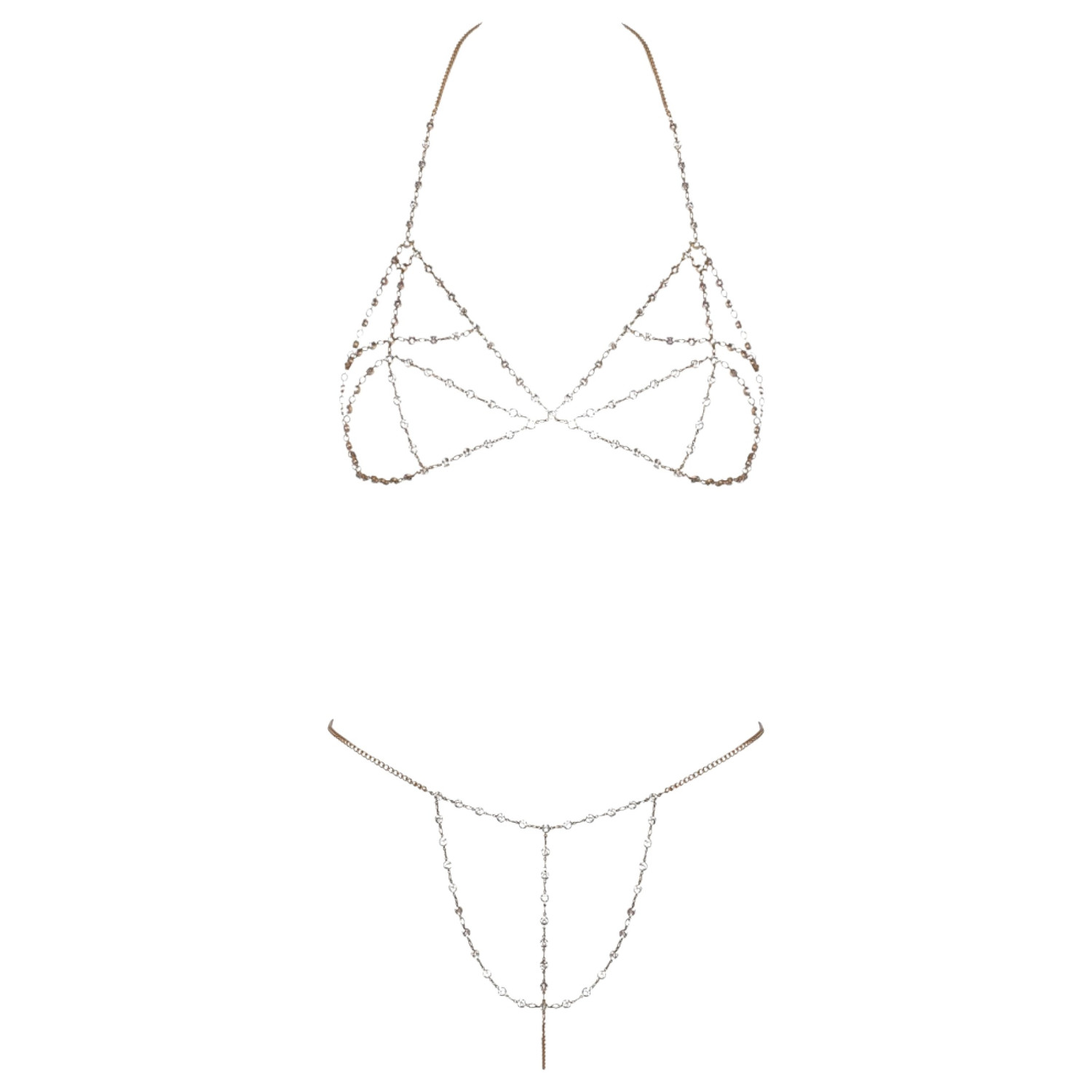 • Az érzéki csillogó strasszköves láncok a mellek és az intim területek vonalán futnak végig, fokozva az erotikus hatást