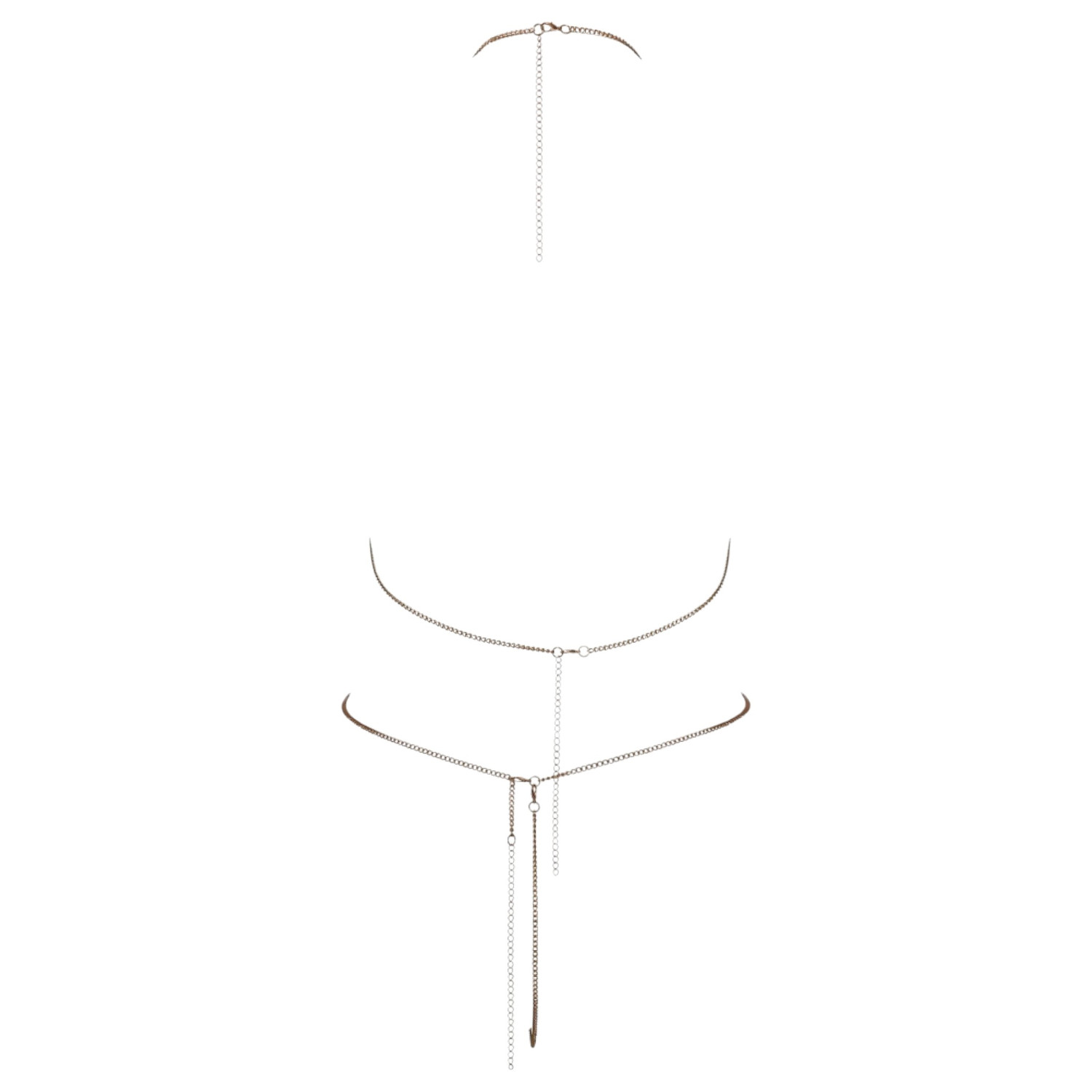 Helyezd a nyakpánt láncát a nyakad köré, és állítsd be a kívánt méretre a hátul található három kapocs segítségével. Igazítsd el a csillogó láncokat a mellek és az intim területek vonalán, hogy a lehető legkényelmesebb és legcsábítóbb megjelenést érhesd el. Viseld önmagában fehérneműként, vagy stílusosan kombinálva fürdőruhával vagy szoros ruhákkal.