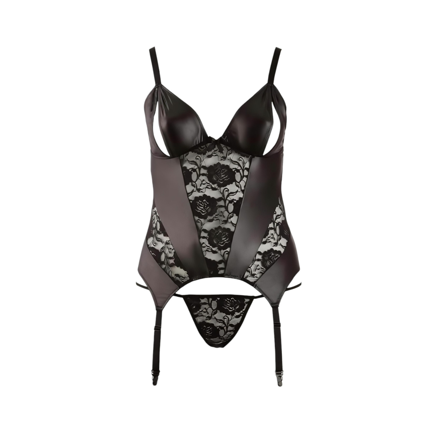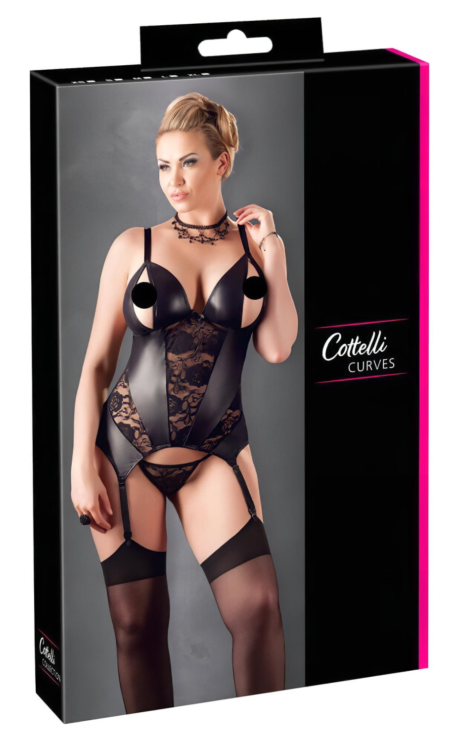Fedezd fel az érzékiség és stílus tökéletes kombinációját ezzel a szexi harisnyatartós felsővel, amely fényes nedves hatású anyagával és finom csipke berakásaival garantáltan lenyűgöz!
