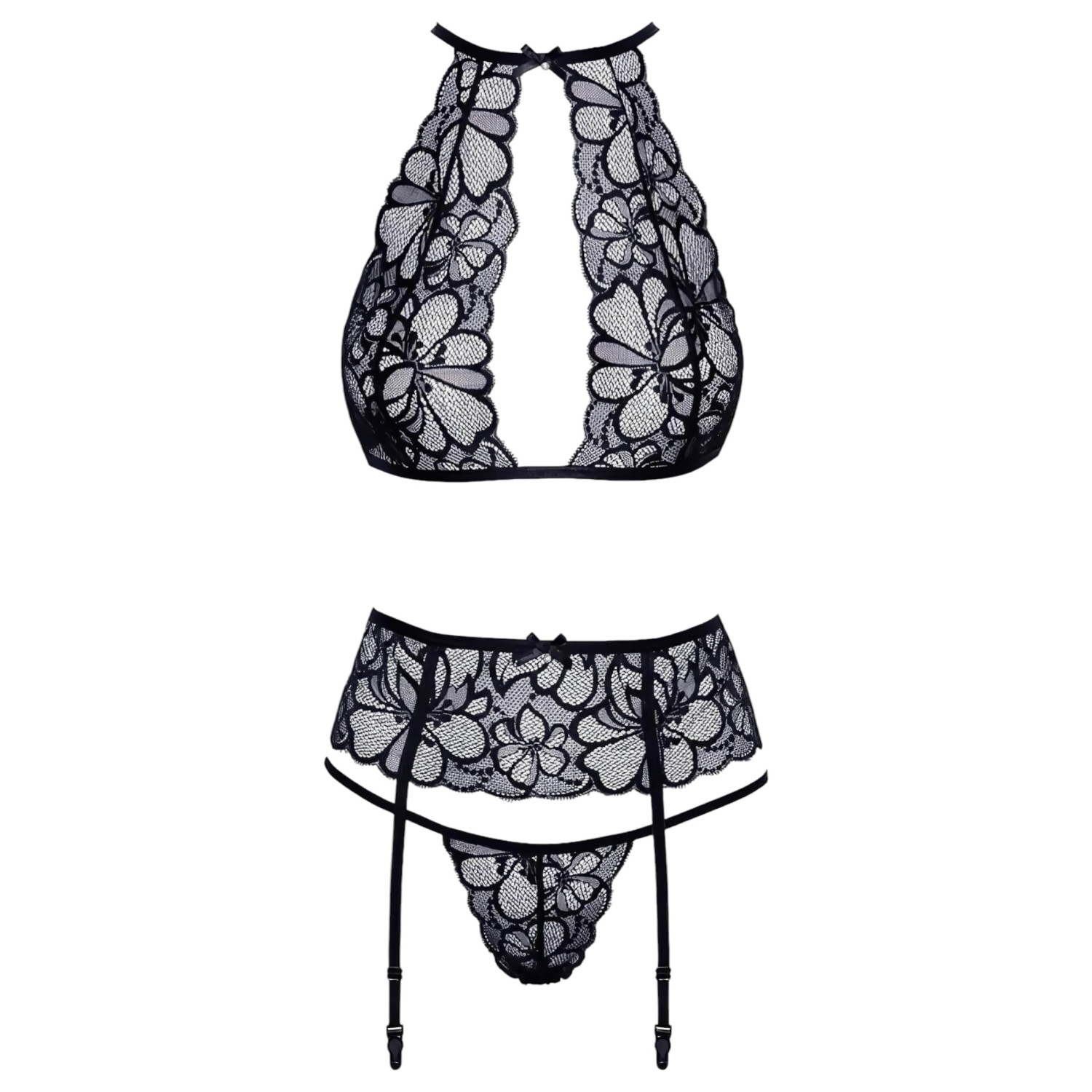 Ez a rendkívül aprószemű neccből készült, háromrészes fehérnemű szett érzéki megjelenést és maximális kényelmet kínál. Aprólékos kidolgozása és állítható pántjai lehetővé teszik a tökéletes illeszkedést, miközben kiemelik a nőies vonalakat.