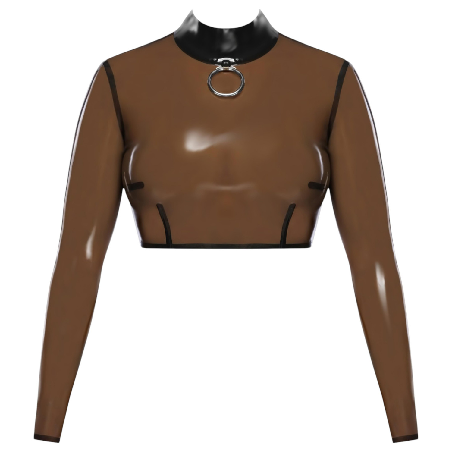 • 1 darab áttetsző, hosszú ujjú latex crop top fémgyűrűs nyakkal