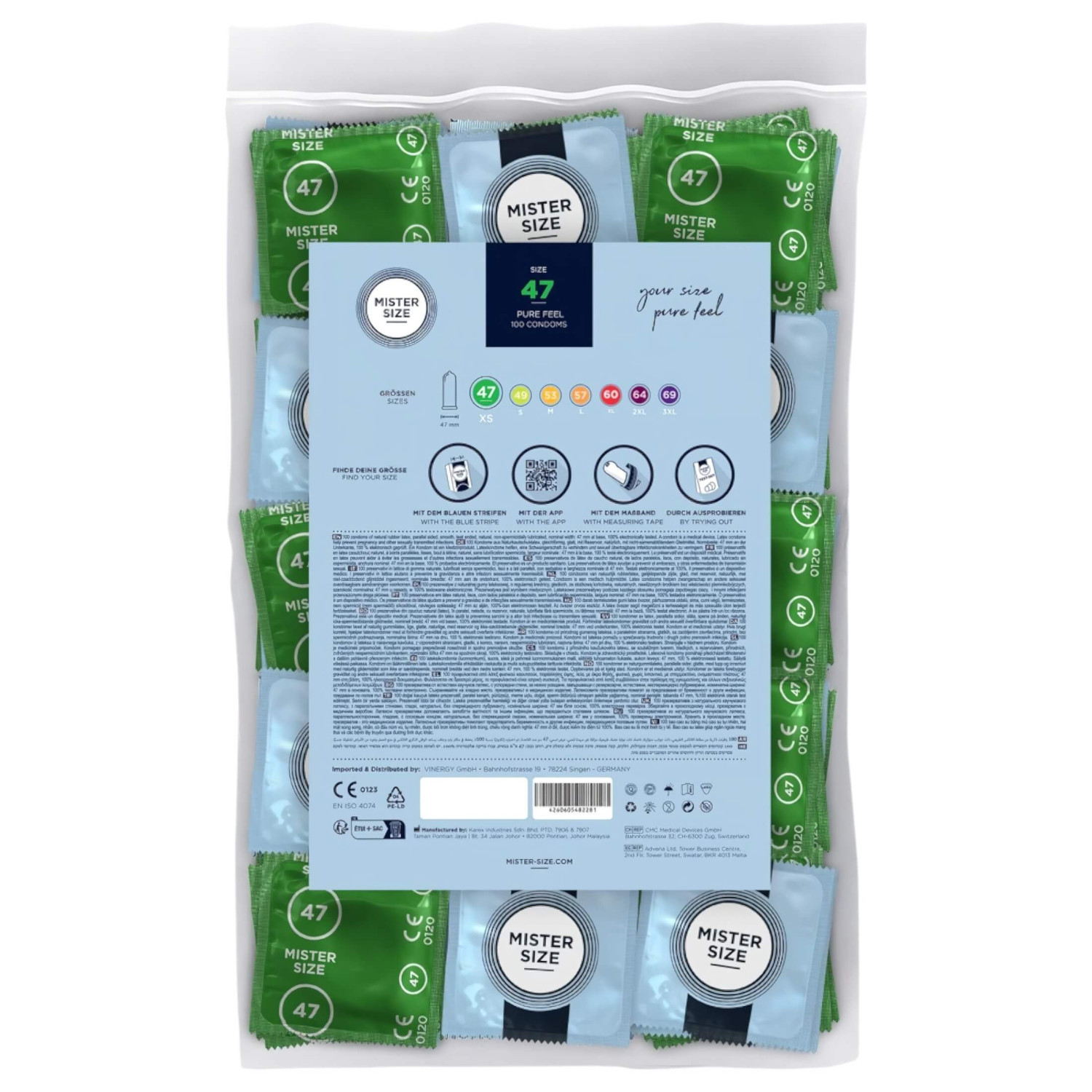 • 100 darab Mister Size 47 mm-es, ultra vékony, síkosított óvszer, egyenként külön csomagolva.