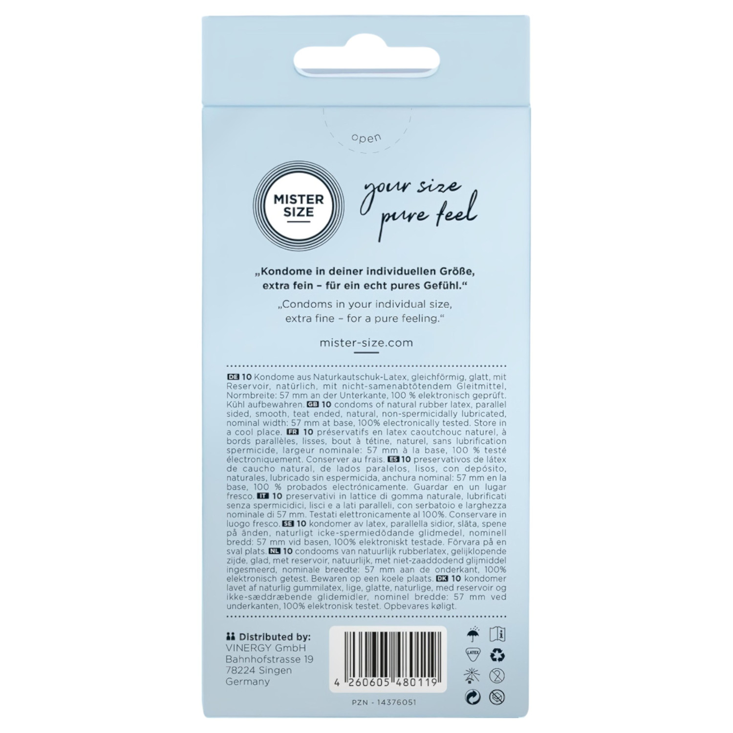 • 10 darab Mister Size 57 mm-es, ultravékony, síkosított óvszer, külön-külön csomagolva.