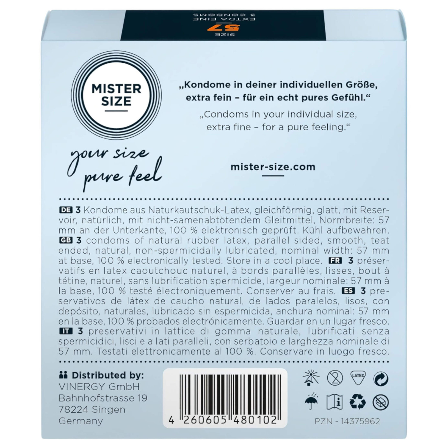 • 3 darab Mister Size óvszer 57 mm-es méretben, külön csomagolva.