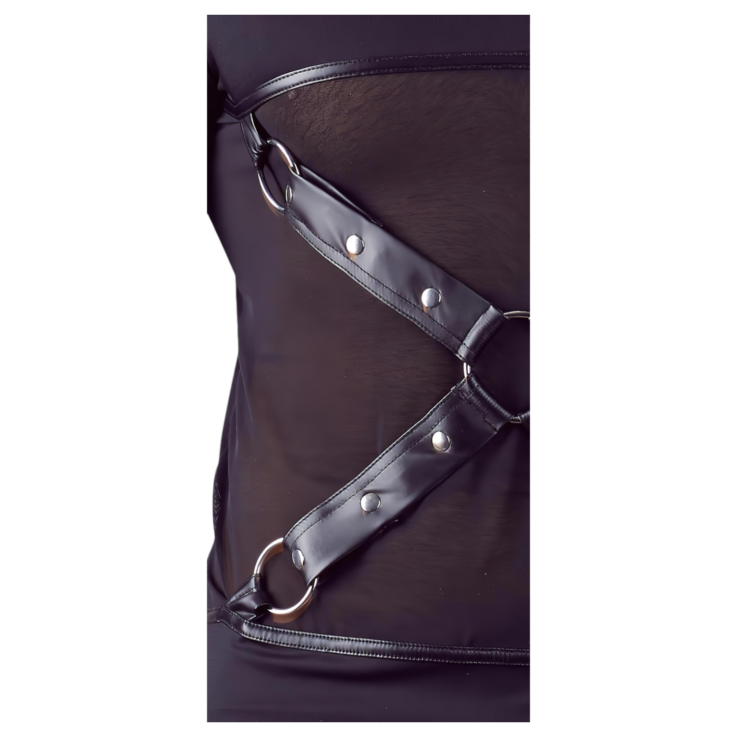 Szexi, selymes tapintású, keresztpántos férfi felső áttetsző necc részletekkel.