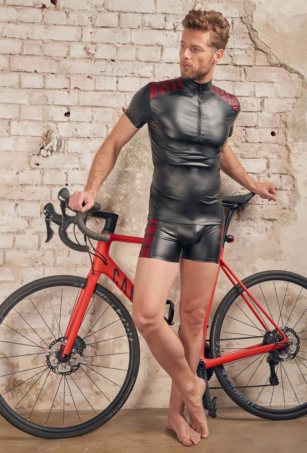Látványos, fényes hatású anyagból készülő szexi férfi felső, a vállaknál bordó csíkos berakással.