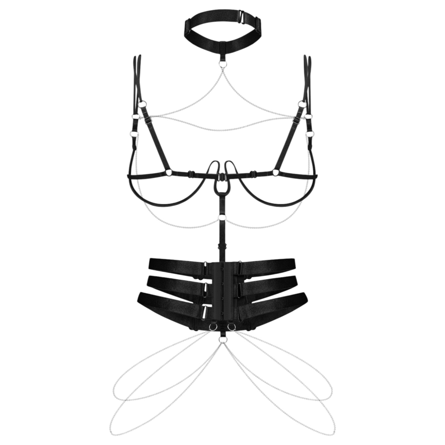 • Extravagáns design – choker, nyitott kosaras melltartó és derékpánt egyben, ezüst színű láncokkal díszítve.