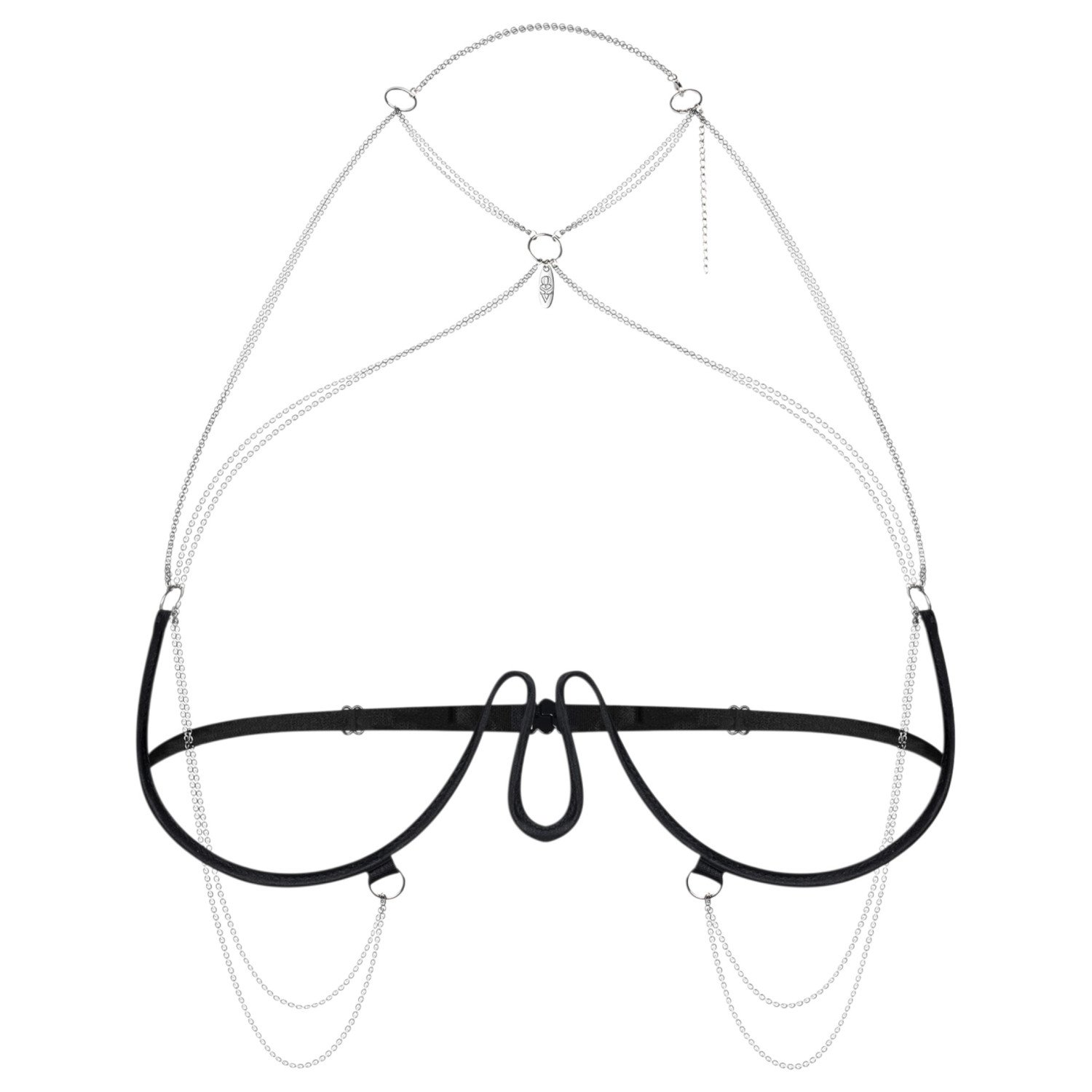 Ez a különleges darab új szintre emeli a csábítást és a nőiesség kiemelését. Az egyedi nyitott kosaras kialakítás hangsúlyozza a kebleket, miközben a láncok és ékszerhatású díszek a dekoltázst és a mell alatti részt teszik még izgalmasabbá. Tökéletes választás különleges alkalmakra, vagy ha egy igazán merész, luxus fehérneművel szeretnéd meglepni párodat – vagy saját magad.