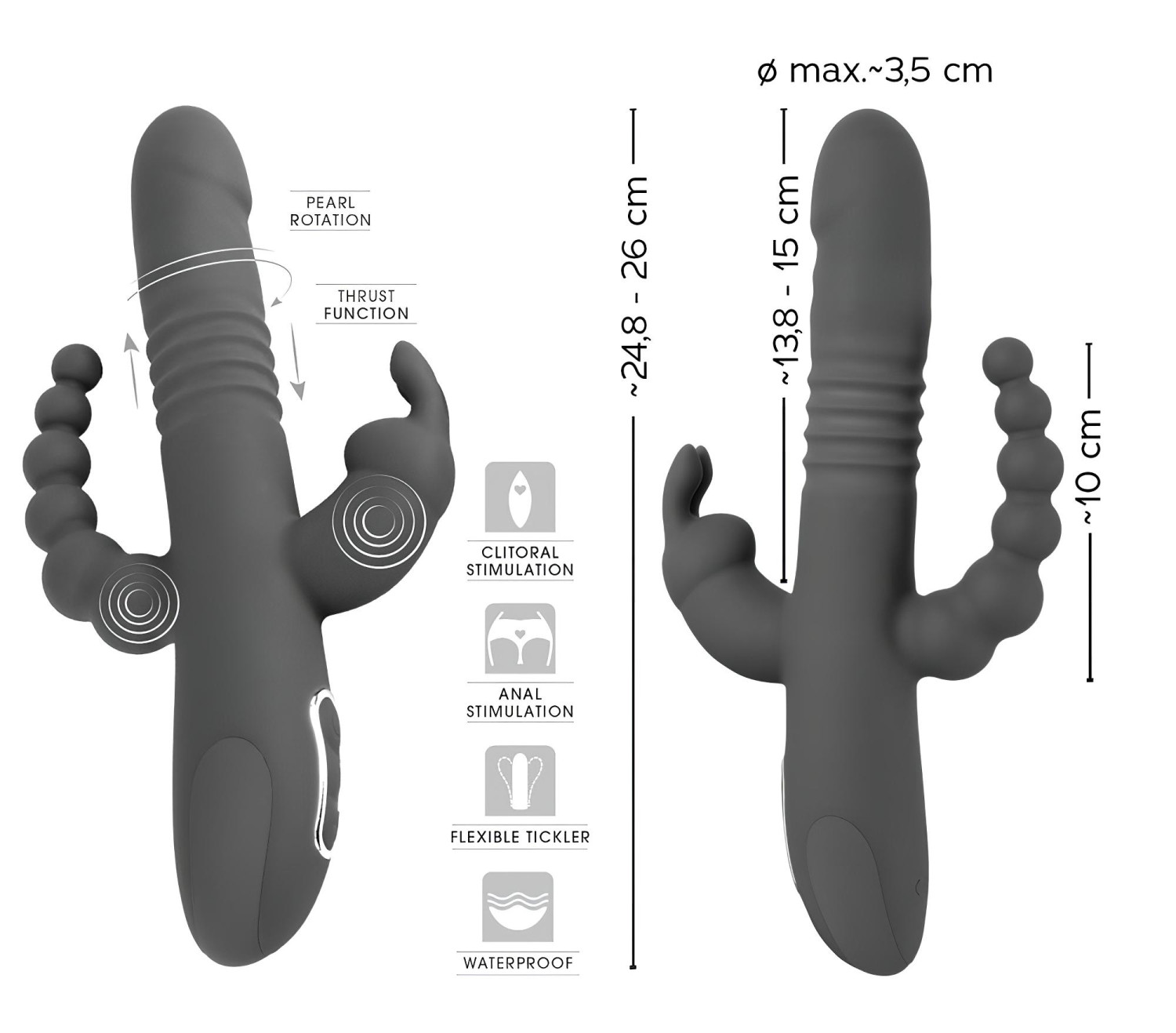 Szilárd alapon, bársonyos érintésű szilikonból készülő, 3 ágú vibrátor, rugalmas, nyuszis csiklóizgatóval és gömbös análizgató karral. A tripla gyönyörszerzéshez!