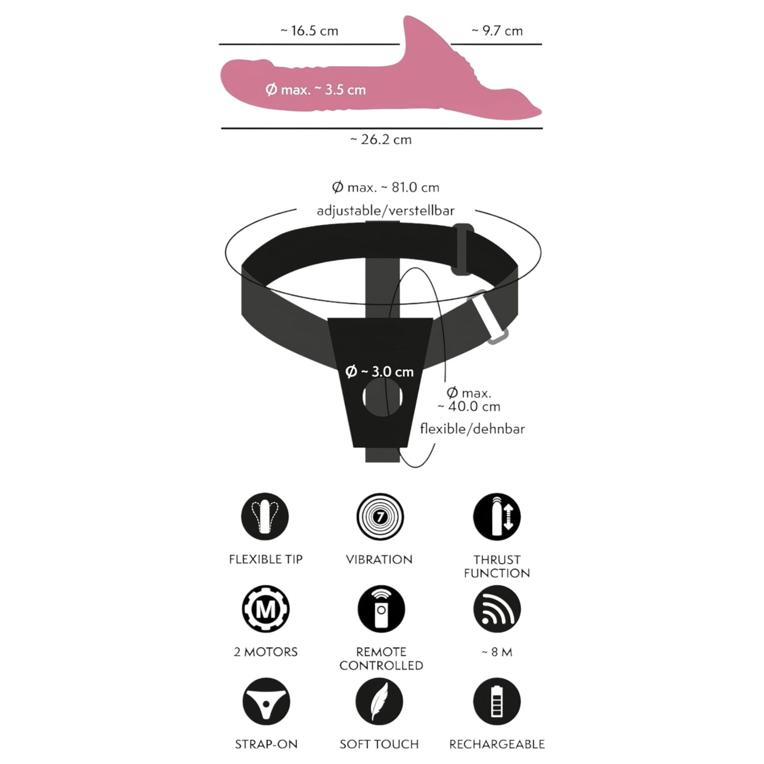 Ez a 3 részes strap-on készlet egy hevedert, egy rezgő vibrátort két motorral és egy távirányítót tartalmaz, amely mindkét fél számára intenzív élvezetet biztosít.