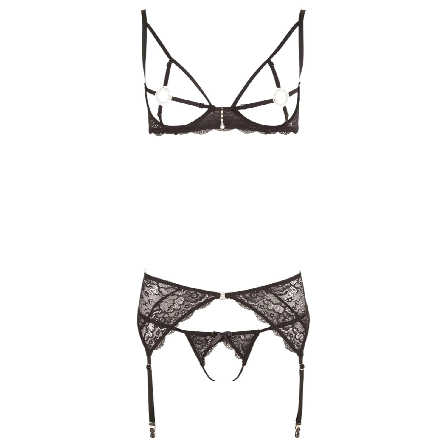 A luxus hatású fehérnemű szett minden apró részlete a csábítást szolgálja. Az ékszerhatású strasszok és a különleges kivágások provokatív, mégis elegáns megjelenést kölcsönöznek. A rugalmas, puha anyag gondoskodik a kényelmes viseletről, miközben a nyitott melltartó és tanga merészséget sugall. Ez a szett tökéletes választás különleges alkalmakra, amikor szeretnéd lenyűgözni partnered.