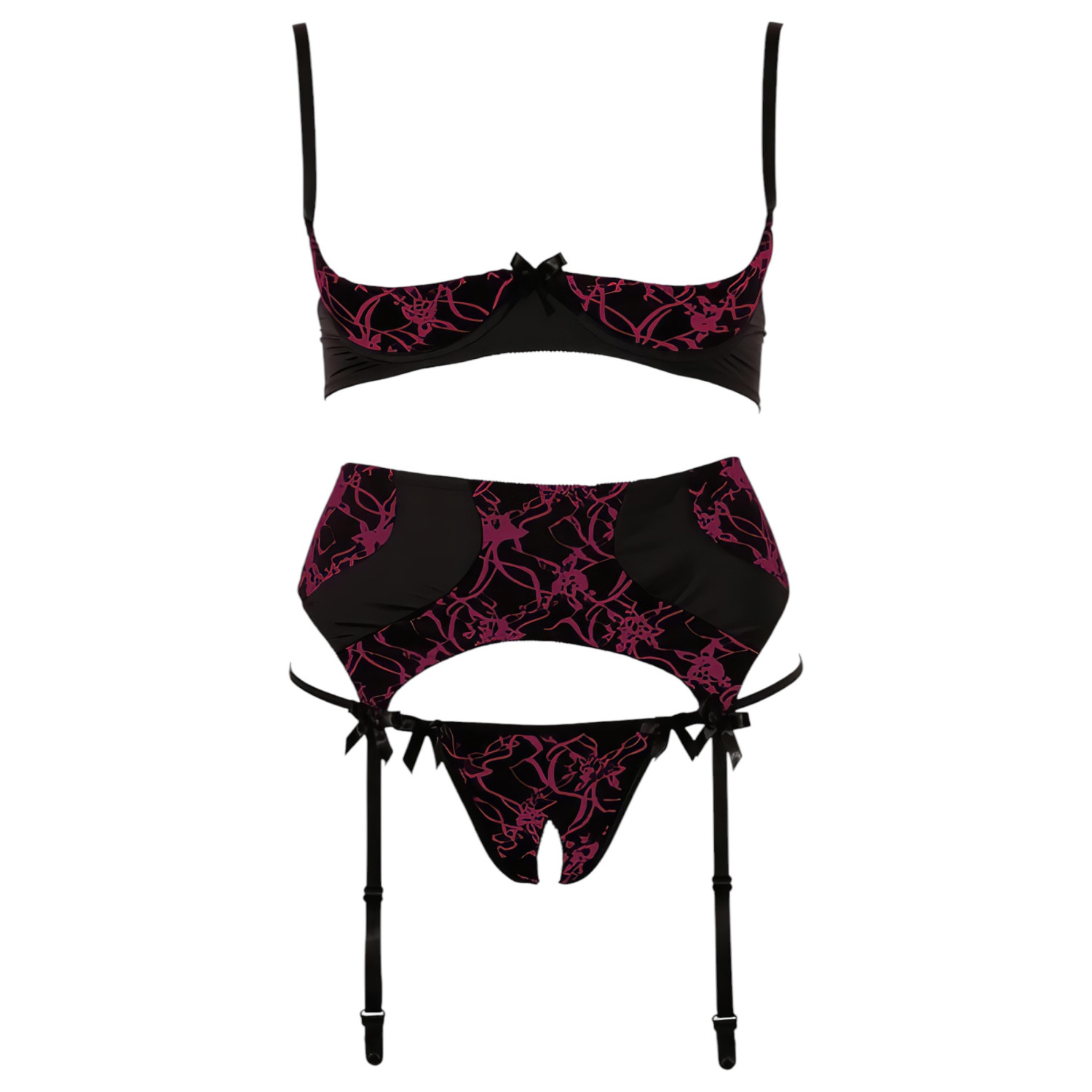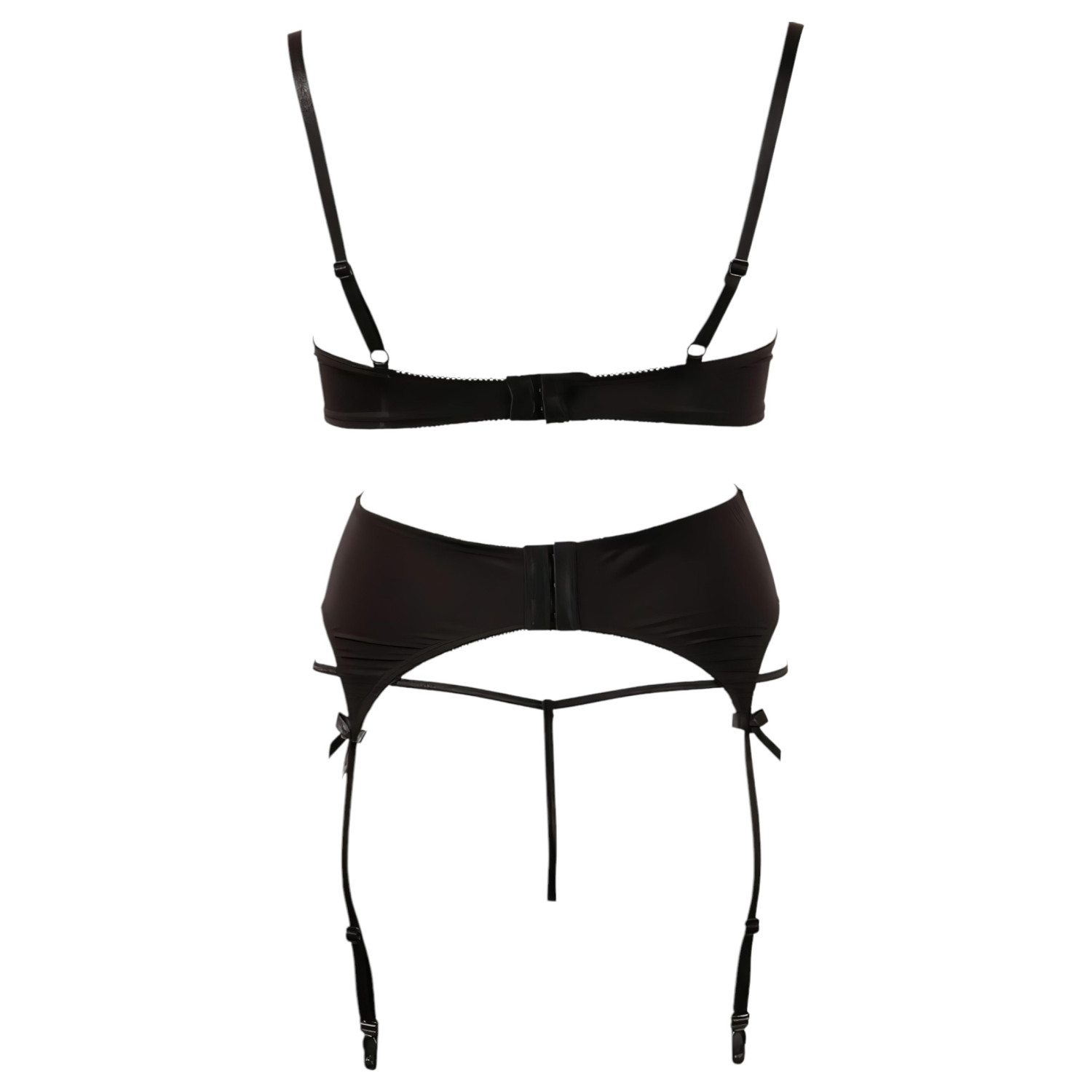 Bújj bele a melltartóba, állítsd be a pántokat a tökéletes illeszkedéshez, majd rögzítsd a harisnyatartót a kedvenc harisnyáddal. Végül egészítsd ki a szettet a nyitott tangával – így válik teljessé a csábító, romantikus megjelenés.