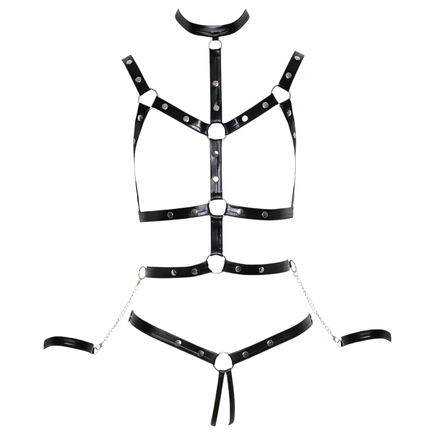 Fedezd fel a csábítás és a kötözés világát ezzel a különleges, két részes hám stílusú body-val, amelyet dekoratív szegecsek díszítenek.