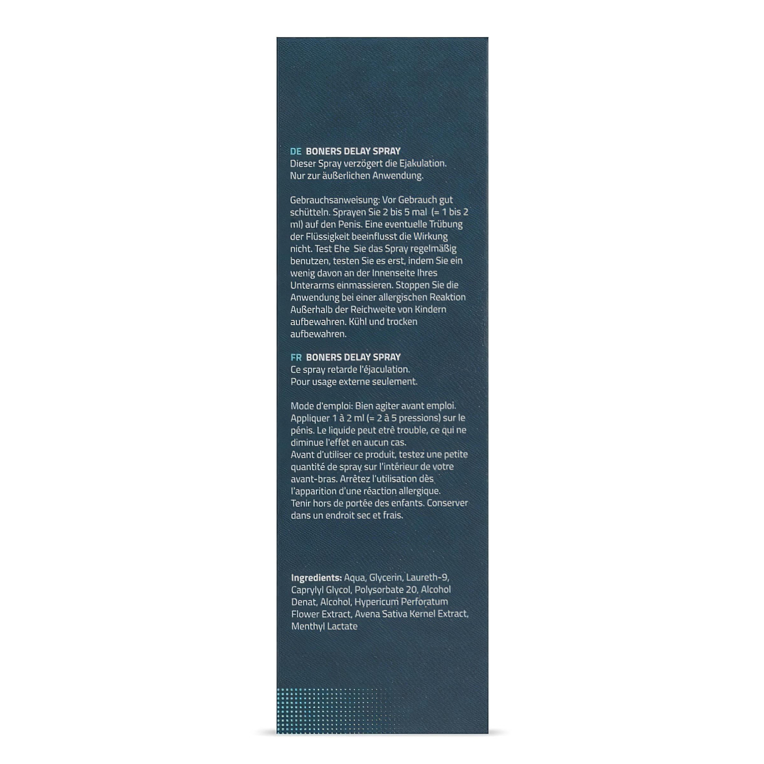 A Boners Delay Spray egy speciálisan férfiak számára kifejlesztett orgazmuskésleltető spray, amely segít meghosszabbítani az együttlétek idejét és csökkenti a túlérzékenységet.