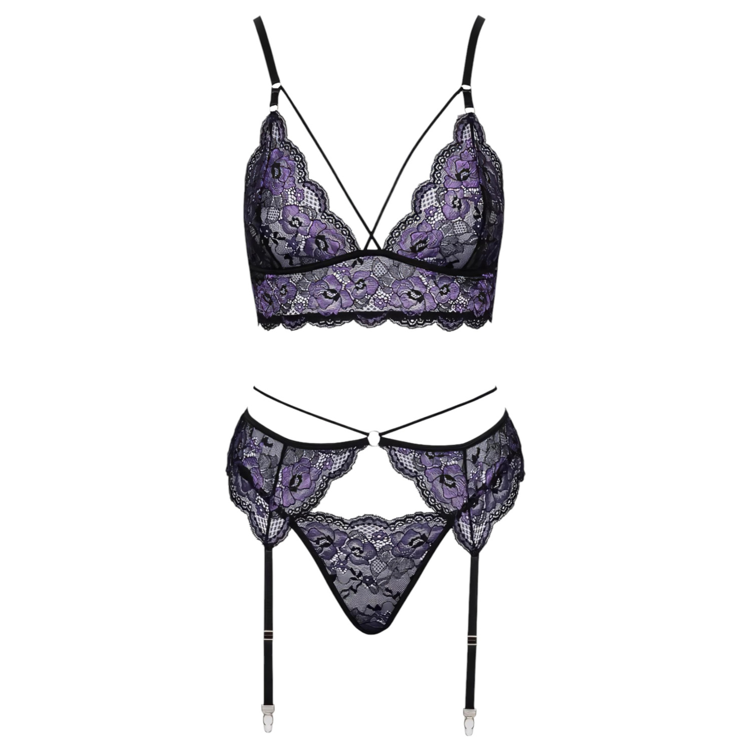 Cottelli - 3 részes csipke fehérnemű szett (fekete-viola)
