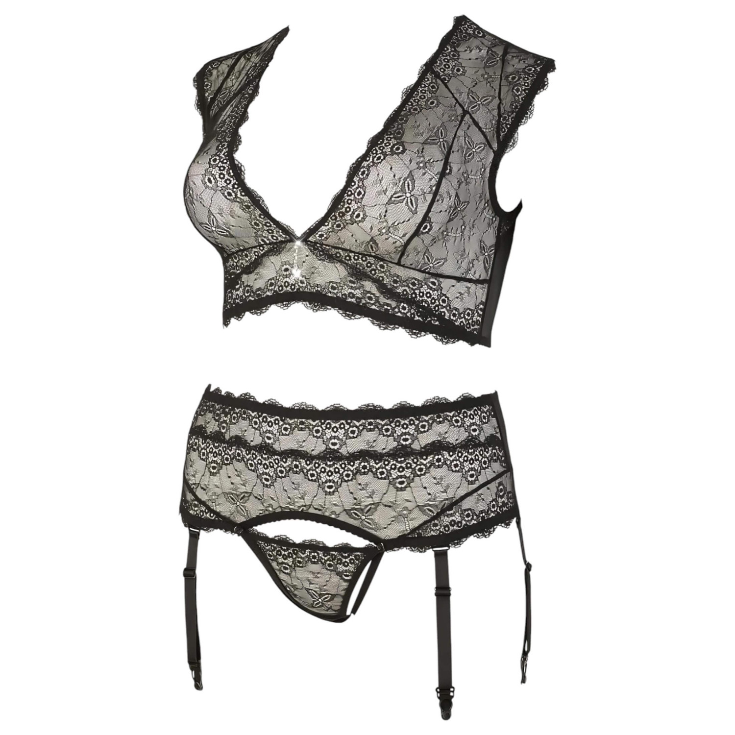 Cottelli Plus Size - strasszos, csipke fehérnemű szett (fekete)
