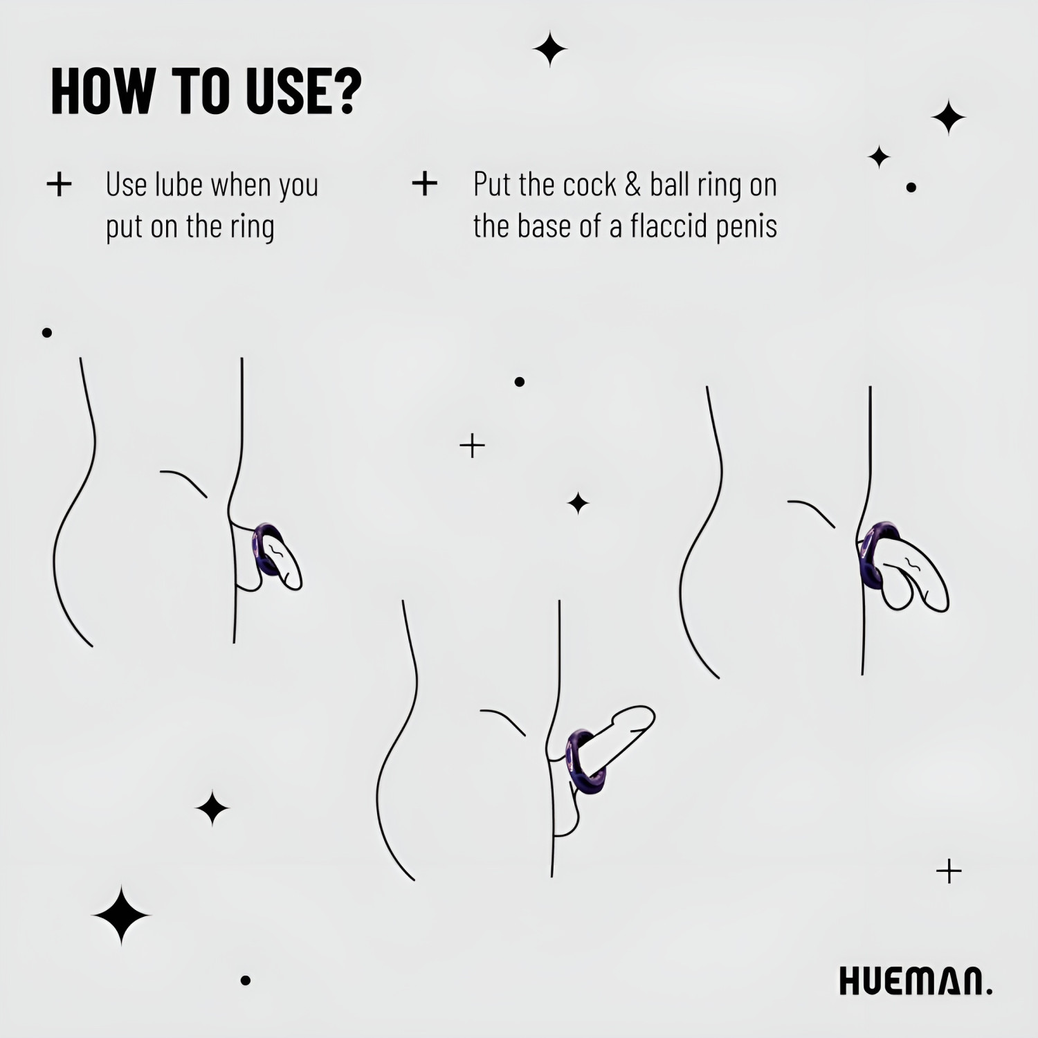 Síkosítsd be a gyűrűt, ha szükséges, akkor a hímvesszőt is. A gyűrűt merev, vagy fél merev állapotban kell felhelyezni a pénisz tövére. Kisebb, normál hímtag esetén a péniszt és a heréket is helyezd bele egyszerre.
