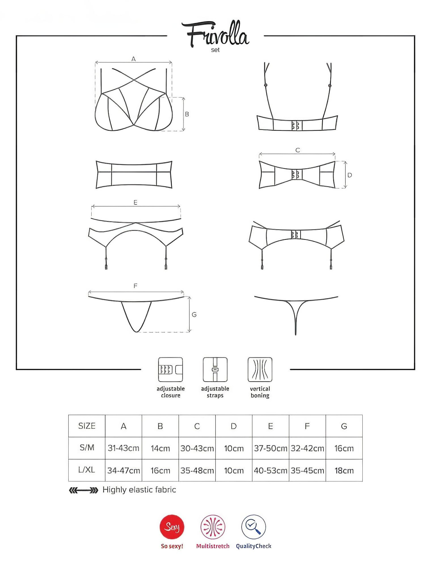 Az Obsessive Frivolla egy igazán pikáns, szemérmetlenül csábító és gyönyörű fehérnemű szett, amely finom csipkével és játékos pántokkal öleli körbe a testet.