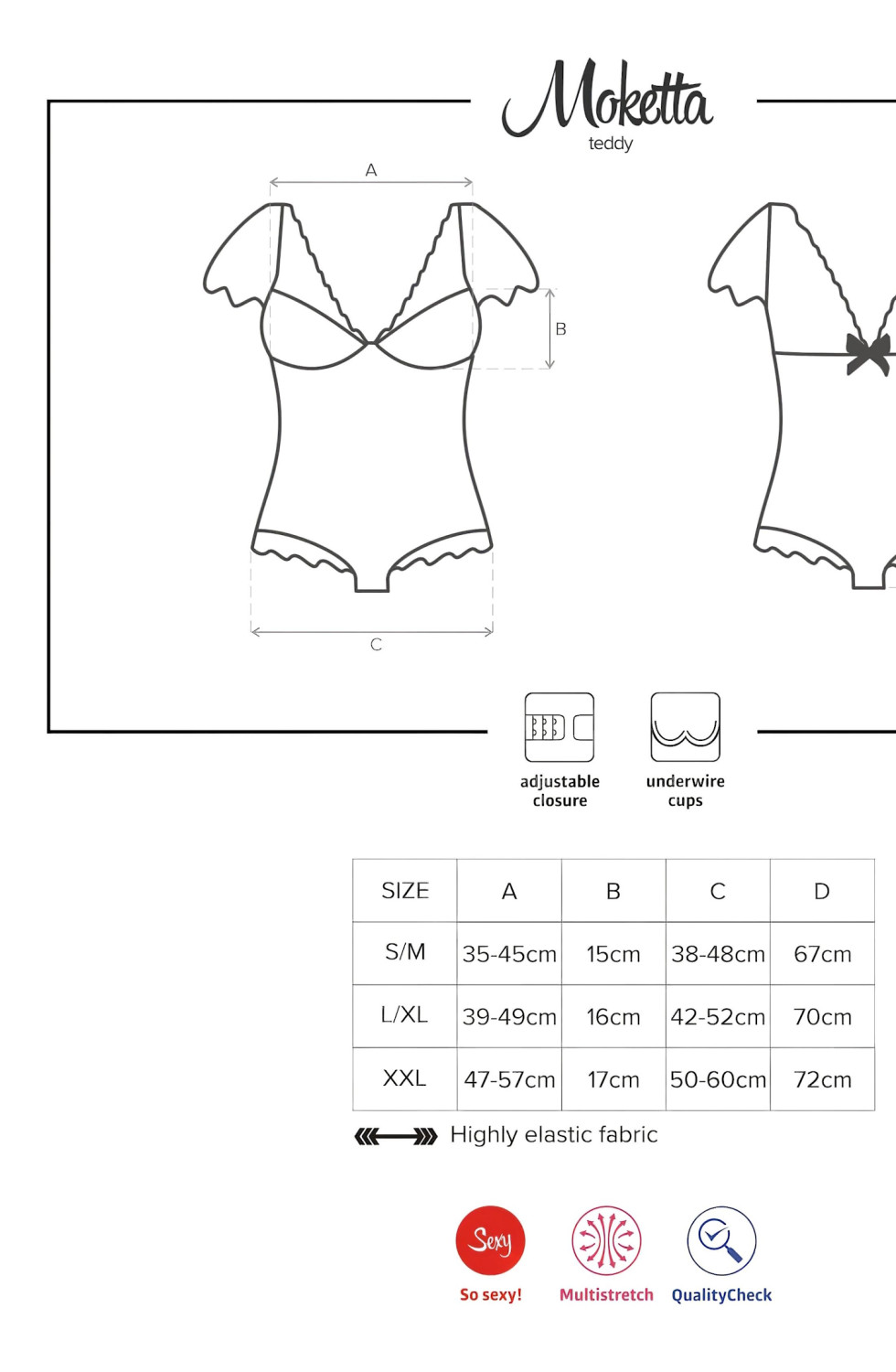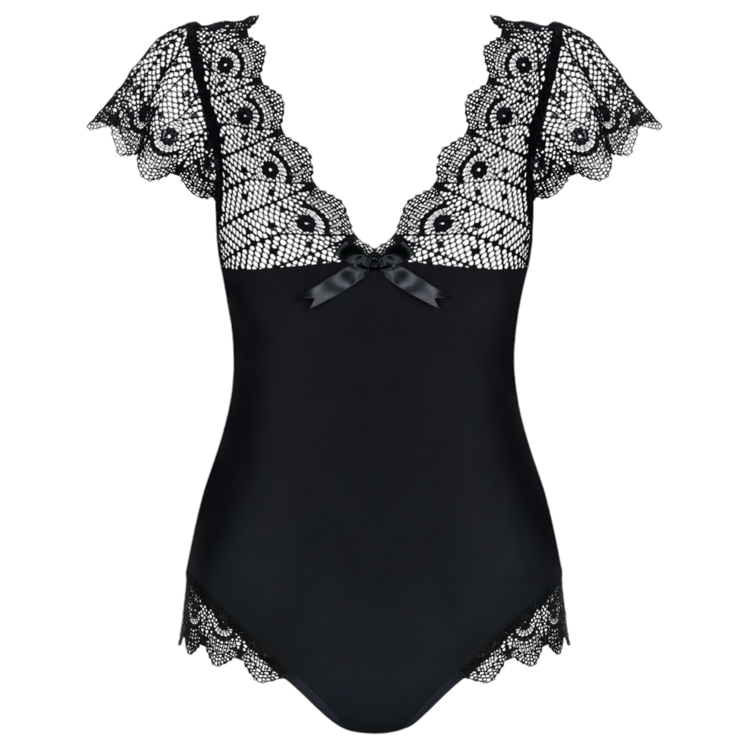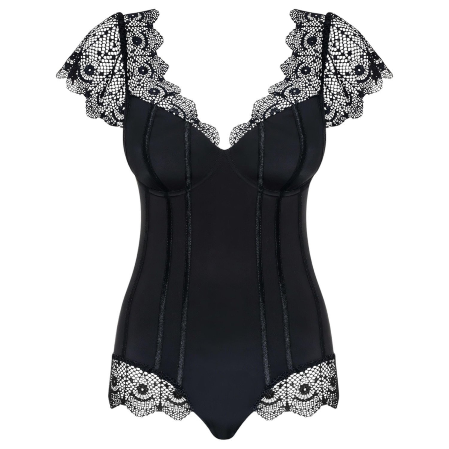 Vélemények Obsessive Moketta - csipke fodros, csíkos body (fekete)
