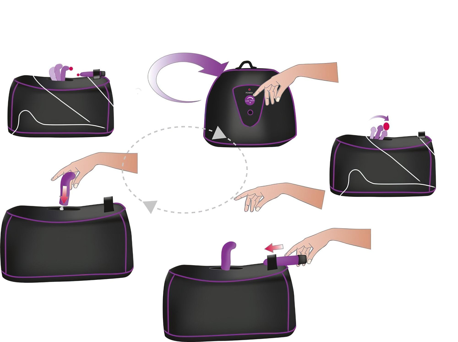 Válaszd ki a kívánt szilikon feltétet, helyezd be a foglalatba, majd csatlakoztasd a hálózatra. A gép oldalán található tekerőgomb segítségével állítsd be a megfelelő forgási sebességet. Ha extra stimulációt szeretnél, helyezd a mellékelt rúdvibrátort a kialakított rekeszbe, és élvezd a kettős élményt!